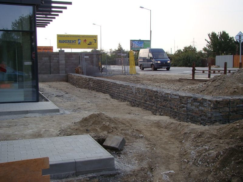 Rozsah stavebných prác: Výškový rozdiel medzi spevnená plocha pri vonkajšom parkovisku a chodníkom bol riešený oporným gabionovým múrikom.